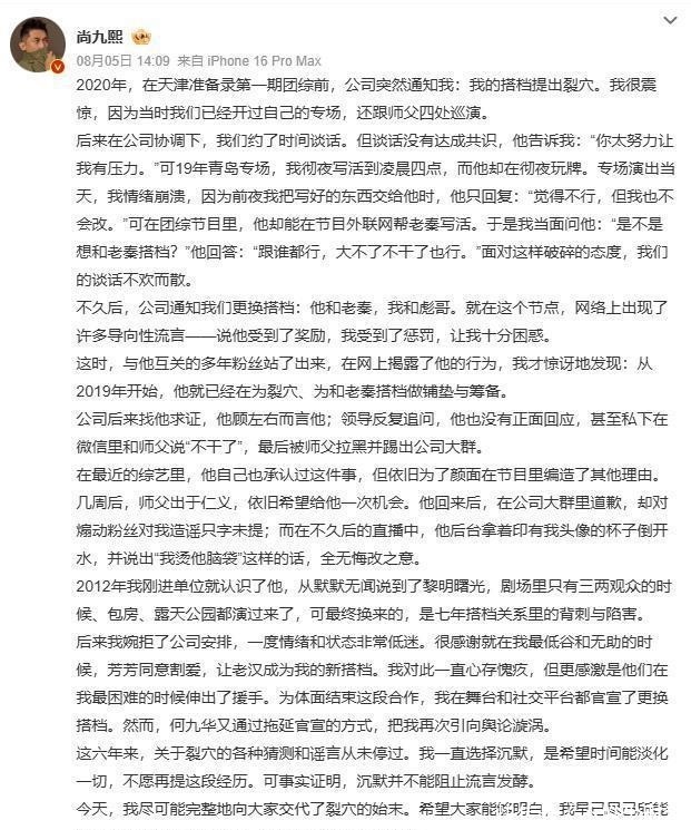 直到2025年8月,尚九熙才通过千字长文还原全部真相;